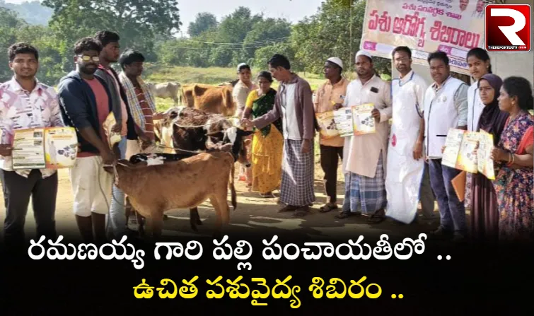 తిరుపతి జిల్లా చంద్రగిరి నియోజకవర్గం పాకాల మండలం రమణయ్యగారిపల్లి పంచాయతీ రవణఖ్ నగర్ లో పశు సంవర్ధక శాఖ ప్రభుత్వం ఉచిత పశు ఆరోగ్య శిబిరం సోమవారం నిర్వహించారు. ఈ కార్యక్రమానికి ముఖ్య అతిథులుగా టిడిపి నేత షాజహాన్ భాష విచ్చేశారు. గ్రామంలో ఉన్నటువంటి పశువులకు పిడుదుల మందు పిచికారి చేసి, మేకలకు, దూడలకు, పశువులకు నట్టల నివారణ మందు తాగించడం జరిగింది. గర్భకోశ వ్యాధులకు చికిత్స చేశారు. టిడిపి నేత షాజహాన్ భాష చేతుల మీదుగా స్థానిక నాయకుల సమక్షంలో పశువులకు సంబంధించిన ప్రభుత్వం తరఫున ఉచిత మందులు పంపిణీ చేశారు. పశువులకు స్ప్రే మందు చేశారు. ఉచిత పశు వైద్య శిబిరాల పట్ల రైతులు హర్షం వ్యక్తం చేశారు. ఈ కార్యక్రమానికి డాక్టర్ వై.బి పవన్ కుమార్, వి.ఎ.ఎస్ హేమంత్ కుమార్, వెంకటేష్, సిబ్బంది పాల్గొన్నారు.