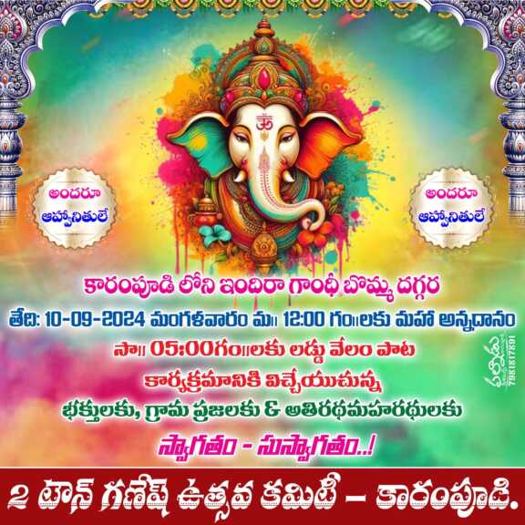 పల్నాడు జిల్లా కారంపూడి పట్టణంలో ఇందిరాగాంధీ బొమ్మ సెంటర్ వద్ద రెండవ పట్టణ గణేష్ ఉత్సవ కమిటీ ఆధ్వర్యంలో వినాయక చవితి వేడుకలలో భాగంగా వినాయక నిమజ్జనం సందర్భంగా మంగళవారం మహా అన్నదాన కార్యక్రమం నిర్వహిస్తున్నారు. మధ్యాహ్నం 12.00 నుండి అన్నదాన కార్యక్రమం ప్రారంభవుతుందని కమిటీ సభ్యులు తెలిపారు. ఈ అన్నదాన కార్యక్రమంలో మండలంలోని ప్రజలు మరియు చుట్టుపక్కల ప్రాంతాల భక్త మహాశయలు పాల్గొని అన్న ప్రసాదాలను స్వీకరించాలని కమిటీ సభ్యులు కోరారు.