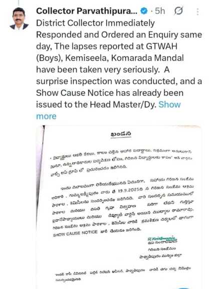 Andhra Pradesh – Parvathipuram | Reporter TV Special Report : The Parvathipuram Manyam District Collector, N. Prabhakar Reddy, has responded immediately to a news report highlighting the severe issues faced by students at the Kemisila Government Tribal Welfare Boys’ Ashram School in Komarada Mandal.