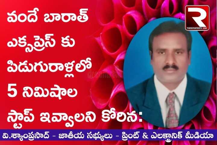 పల్నాడు జిల్లా : సికింద్రాబాద్ నుండి తిరుపతి వెళ్లే వందే భారత్ ఎక్సప్రెస్ రైలు పల్నాడు జిల్లా పిడుగురాళ్ల లో 5 నిమిషాల స్టాప్ ఇవ్వాలని ప్రింట్ & ఎలక్ట్రానిక్ మీడియా రిపోర్టర్స్ అసోసియేషన్ జాతీయ సభ్యులు వి.శ్యాంప్రసాద్ కోరారారు. అయన మాట్లాడుతూ సికింద్రాబాద్ నుండి తిరుపతికి వెళ్లే భక్తుల కొరకు త్వరలో కొత్తగా ప్రవేశపెట్టనున్న వందే భారత్ ఎక్సప్రెస్ రైలు 9వ తేదీ నుండి అందుబాటులో ఉంటుంది అని రైల్వే అధికారులు చెబుతున్నారు. ఈ రైలు నల్గొండ గుంటూరు, ఒంగోలు, నెల్లూరు జిల్లాల మీదుగా తిరుపతికి చేరుకుంటుంది. ప్రధానమంత్రి నరేంద్ర మోడీ గారు 8న సికింద్రాబాద్ స్టేషన్ లో ఈ రైలును ప్రారంభించు చున్నారు. కావున కేంద్ర ప్రభుత్వం వారికీ , రైల్వే అధికారులకు నా విన్నపం ఏమనగా కొత్తగా ఏర్పాటు చేసిన పల్నాడు జిల్లాకు పిడుగురాళ్ల పట్నంలో 5 నిమిషాల స్టాప్ ను కల్పించినట్లయితే .. పుణ్యస్థలం తిరుమలకు వెళ్లడానికి జిల్లా ప్రజలకు ఎంతగానో ఉపయోగకరంగా ఉంటుందని తెలిపారు. అలాగే పల్నాడు జిల్లా వైఎస్ఆర్సిపి నాయకులు, తెలుగుదేశం పార్టీ నాయకులు, భారతీయ జనతా పార్టీ నాయకులు ఇతర పార్టీ నాయకులు ఆలోచించి వెనుకబడిన పల్నాడు జిల్లాను దృష్టిలో పెట్టుకొని రైల్వే అధికారులకు వినతి పత్రాన్ని ఇవ్వాలని కోరారు. పల్నాడు జిల్లా ప్రజల యొక్క విన్నపమును దృష్టిలో పెట్టుకొని పిడుగురాళ్ల పట్టణంలో వందే భారత్ రైలు స్టాప్ కొరకు కృషి చేయాలని ప్రింట్ & ఎలక్ట్రానిక్ మీడియా జాతీయ సభ్యులు వంగవరపు శ్యాం ప్రసాద్ కోరారు .