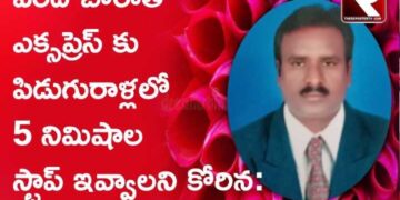 పల్నాడు జిల్లా : సికింద్రాబాద్ నుండి తిరుపతి వెళ్లే వందే భారత్ ఎక్సప్రెస్ రైలు పల్నాడు జిల్లా పిడుగురాళ్ల లో 5 నిమిషాల స్టాప్ ఇవ్వాలని ప్రింట్ & ఎలక్ట్రానిక్ మీడియా రిపోర్టర్స్ అసోసియేషన్ జాతీయ సభ్యులు వి.శ్యాంప్రసాద్ కోరారారు. అయన మాట్లాడుతూ సికింద్రాబాద్ నుండి తిరుపతికి వెళ్లే భక్తుల కొరకు త్వరలో కొత్తగా ప్రవేశపెట్టనున్న వందే భారత్ ఎక్సప్రెస్ రైలు 9వ తేదీ నుండి అందుబాటులో ఉంటుంది అని రైల్వే అధికారులు చెబుతున్నారు. ఈ రైలు … Continue reading వందే బారాత్ ఎక్సప్రెస్ కు పిడుగురాళ్లలో 5 నిమిషాల స్టాప్ ఇవ్వాలని కోరిన వి.శ్యాంప్రసాద్ – జాతీయ సభ్యులు – ప్రింట్ & ఎలక్ట్రానిక్ మీడియా