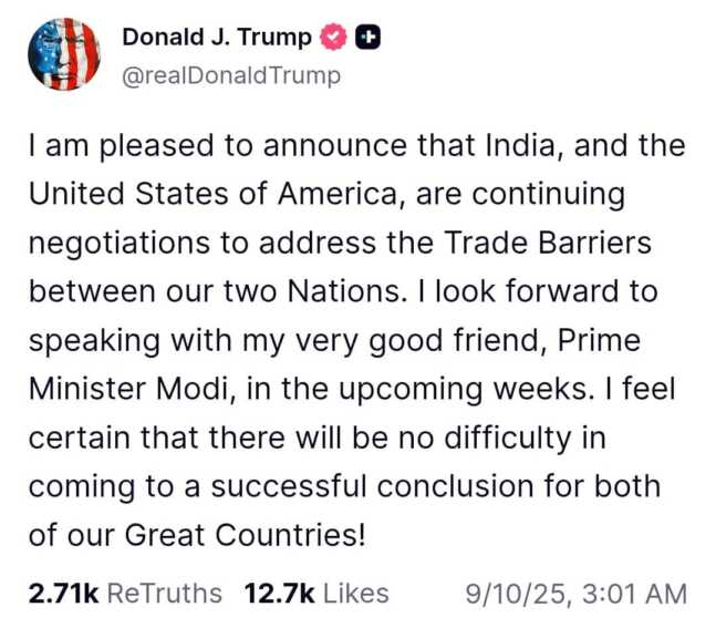 “I am pleased to announce that India, and the United States of America, are continuing negotiations to address the Trade Barriers between our two nations,” Trump wrote in his post on Tuesday. He further described his strong bond with Modi, stating, “I look forward to speaking with my very good friend, Prime Minister Modi, in the upcoming weeks. I feel certain that there will be no difficulty in coming to a successful conclusion for both of our Great Countries!”