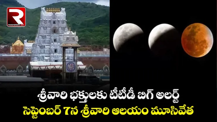 తిరుమల: తిరుమల శ్రీవారి భక్తులకు బిగ్ అలర్ట్. సెప్టెంబర్ 7న చంద్రగ్రహణం కారణంగా శ్రీవారి ఆలయం మూసివేయనున్నారు. ఆదివారం మధ్యాహ్నం 3.30 గంటల నుండి సోమవారం ఉదయం 3 గంటల వరకు అంటే..ఆదివారం మధ్యాహ్నం 3.30 గంటల నుండి సోమవారం ఉదయం 3 గంటల వరకు అంటే.. 12గంటల పాటు శ్రీవారి ఆలయం మూసి ఉంచుతారు. ఆ సమయంలో దర్శనాలు ఉండవు.